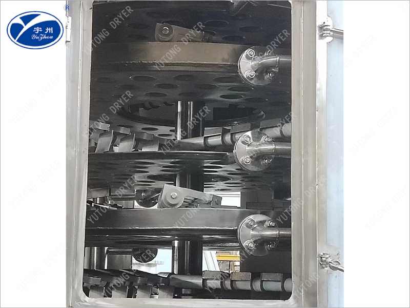 2, the particle size of the battery material powder is fine, and it is very easy to fall into the bottom layer during the fall of each layer of material, and the uneven drying will make the fine powder penetrate into the bearing. In view of this situation, our company has made special improvements, adding a labyrinth seal in the middle of the last plate, so that the material on the top plate will slide smoothly into the discharge plate along the cone when it falls, and the situation of micro-powder entering the bearing will not occur;