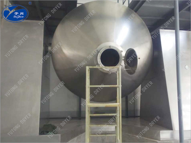 SZG series double-cone rotary vacuum dryer is a double-cone rotary tank. In the vacuum state, steam or hot water is heated into the jacket, and the heat is in contact with the wet material through the inner wall of the tank. The vapor evaporates after the wet material absorbs heat and is pumped away through the vacuum pump through the vacuum exhaust pipe. Because the tank is in a vacuum state, and the rotation of the tank makes the material constantly up and down, inside and outside, it speeds up the drying speed of the material, improves the drying efficiency, and achieves the purpose of uniform drying.