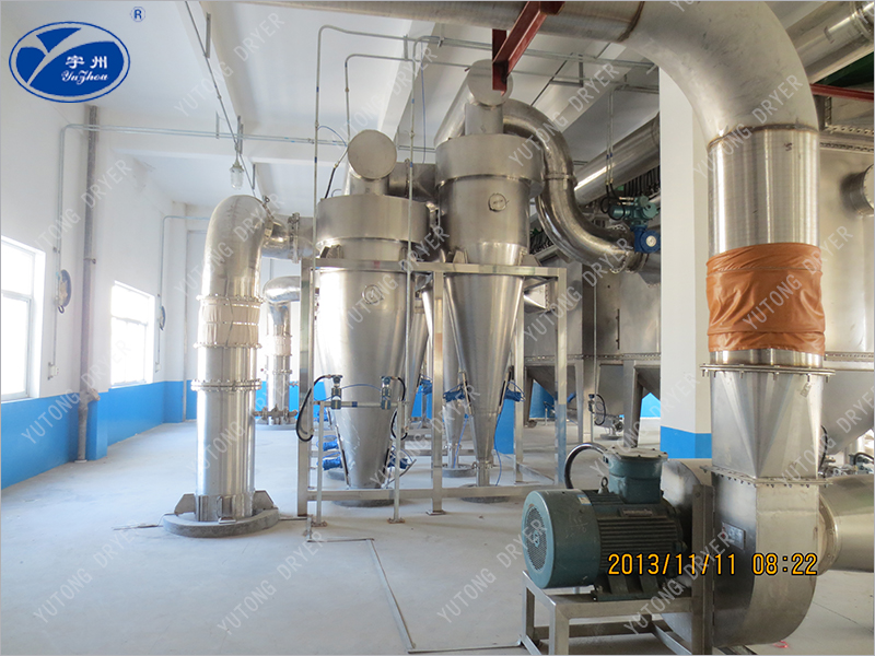 Natural wind is used for drying. After the natural wind passes through the air filter, it is heated by the fan into the air heating equipment. The heated hot air is then distributed into a cyclone with uniform flow rate and direction by the hot air distributor of the flash main engine. The cyclone contacts and colliding with the wet material added by the spiral feeder, initiating a series of physical changes such as mass and heat exchange and separation, so that the material is separated from the wet content and finally dry.