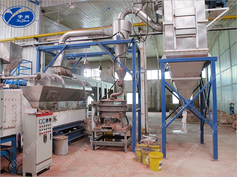 物料為硫酸鎳,具有強酸性及強腐蝕性,我司針對這一特點,在設備制造上進行升級及改進,振動流化床的上箱體和下箱體以及內表壁均采用3mm的玻璃鋼全貼附,振動板采用特制鎳板沖鴨舌孔制作,尾氣排放全部采用耐高溫耐腐蝕的玻璃鋼材料制作。支撐架和支撐管也特別采用了碳鋼特氟龍材料。為了使排放達到良好效果,布袋除塵器的布袋選擇特殊材質,極其耐酸,連引風機變頻調風也采用了FRP制作。此工藝很好的解決了材料干燥過程中遇到的高溫、高腐蝕的難題。