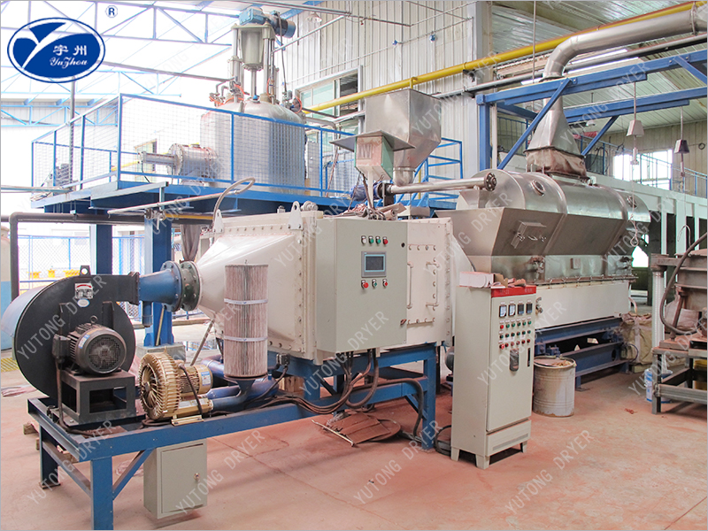 物料自進料口進入機內,在振動電機或其他方式提供的激振力作用下,在空氣分布板上跳躍前進,同時空氣經過濾后,被加熱到一定溫度,由風口進入干燥機下風室中,物料在振動力和經空氣分布板均風的熱氣流雙重作用下,呈懸浮狀態與熱氣流接觸,物料顆粒與熱介質之間進行著激烈的湍動,使傳熱和傳質過程得以強化,干燥后的產品由排料口排出,蒸發出的水份和廢氣經旋風分離器回收粉塵后,排入大氣。下床體為床層提供了一個穩定的具有一定壓力的風室。調節引風機,使上箱體中床層物料上部保持微負壓,維持良好干燥環境并防止粉塵外泄。